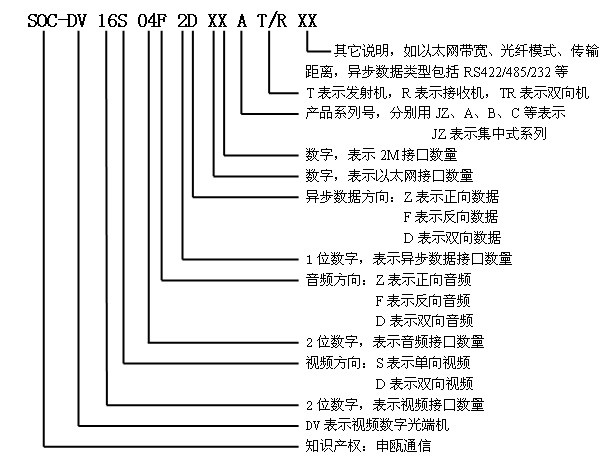 SOC-DV00D04F0D12AT10: 4路反向音頻、1個以太網(10M)、2個2M發射A型視頻光端機;
